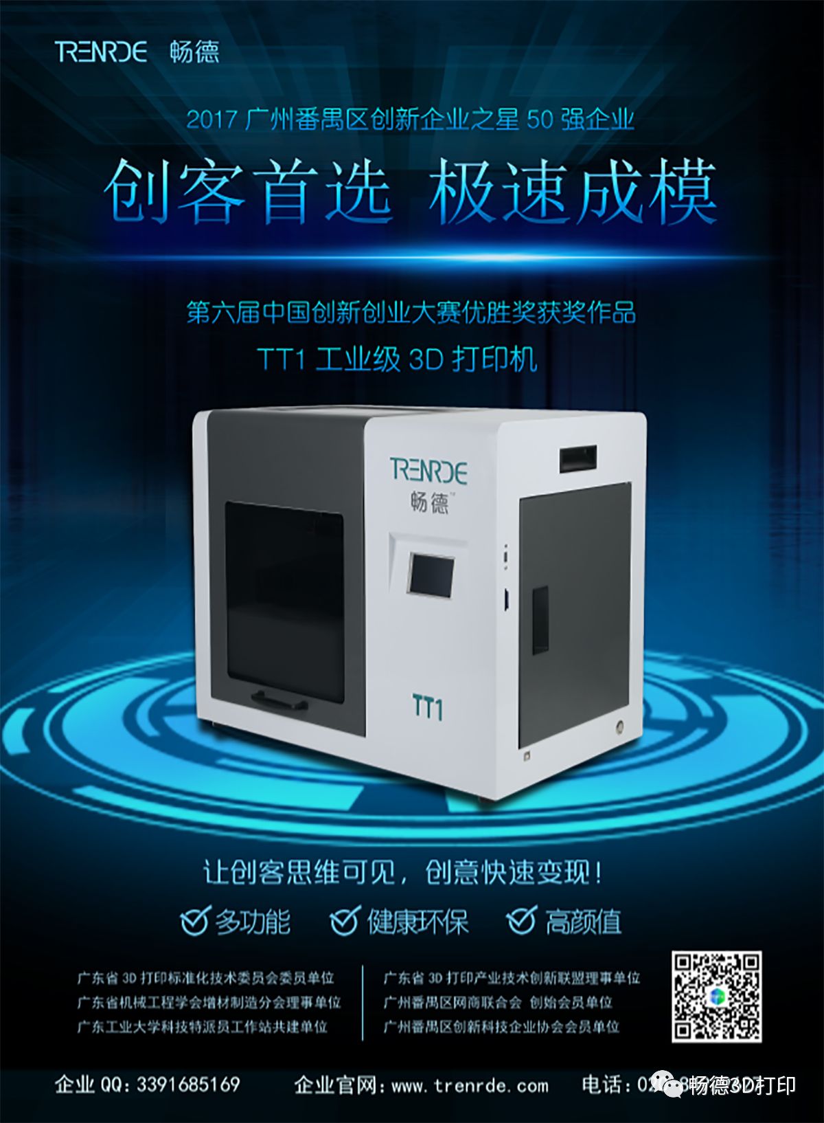 Trenrde(畅德科技)提供全面的3D产品和服务,包括3D打印机、打印材料、设计原型制作、按需定制部件和数字设计工具。公司的创新应用解决方案覆盖了从产品设计到工厂车间的先进应用。从创客教育,工业制造,到精准医疗解决方案的模拟、虚拟手术规划、医疗、牙科设备以及给患者定制的外科手术器械的打印。作为3D打印的高科技企业与未来3D解决方案的开发者,Trenrde 3D团队化费了多年时间帮助专业人士和企业优化他们的设计、改造工作流程,将创新产品推向市场、驱动新的商业模式。