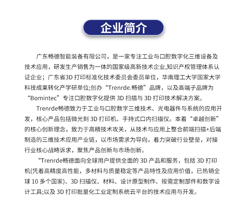 Trenrde畅德面向全球用户提供全面的3D产品和服务,包括3D打印机、3D扫描仪、材料、设计原型制作、按需定制部件和数字设计工具。 上一条:CUV 1000 固化机